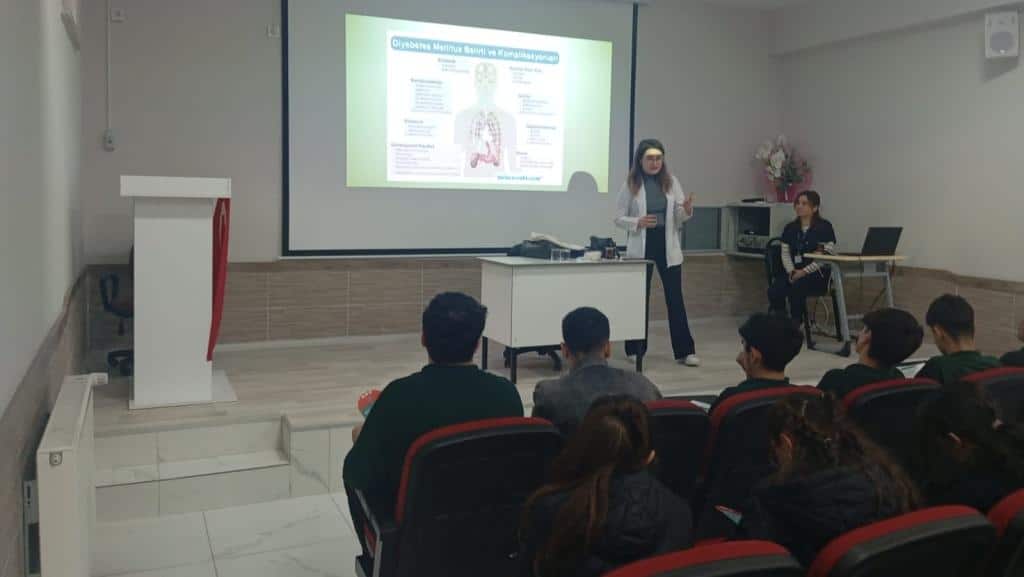 Eğitimde, dengeli beslenmenin önemi, hareketsiz yaşamın zararları, şeker hastalığının belirtileri ve korunma yolları gibi konular ele alındı. Sağlık personelleri, öğrencilerimize günlük yaşamlarında uygulayabilecekleri sağlıklı alışkanlıklar kazandırmak için örneklerle ve interaktif bir anlatımla sunumlarını gerçekleştirdiler.