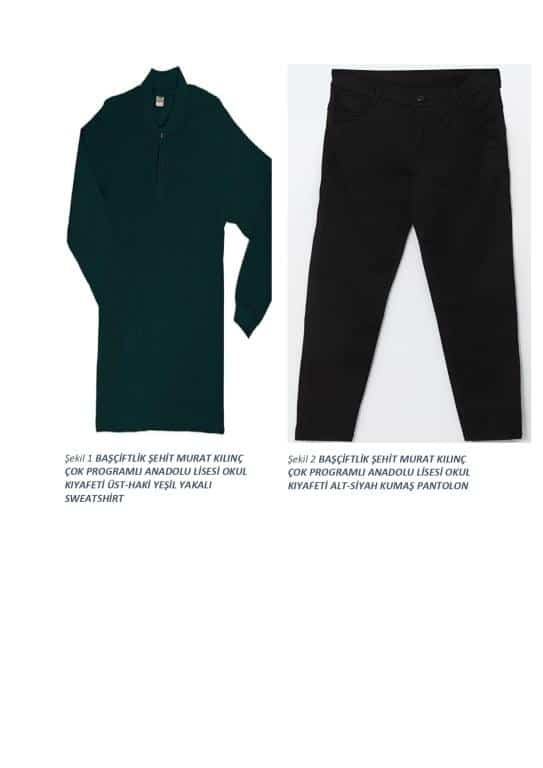 2025-2026 Eğitim Öğretm yılı ve sonrası için okulumuz ve Okul Aile Birliği tarafından belirlenmiş olan okul kıyafetimiz üst için haki yeşil sweatshirt alt için siyah kumaş pantolon olarak belirlenmiştir. Milli eğitim Bakanlığının almış olduğu karar doğrultusunda kılık kıyafet uygulaması okullarda zorunlu olarak uygulanacaktır.